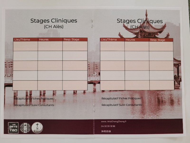 Seront remis aux étudiants et jeunes praticiens stagiaires un Livret de suivi de stage effectué sur l’hopital d’ales, dans le cadre de l’association ArtsChengZhong.